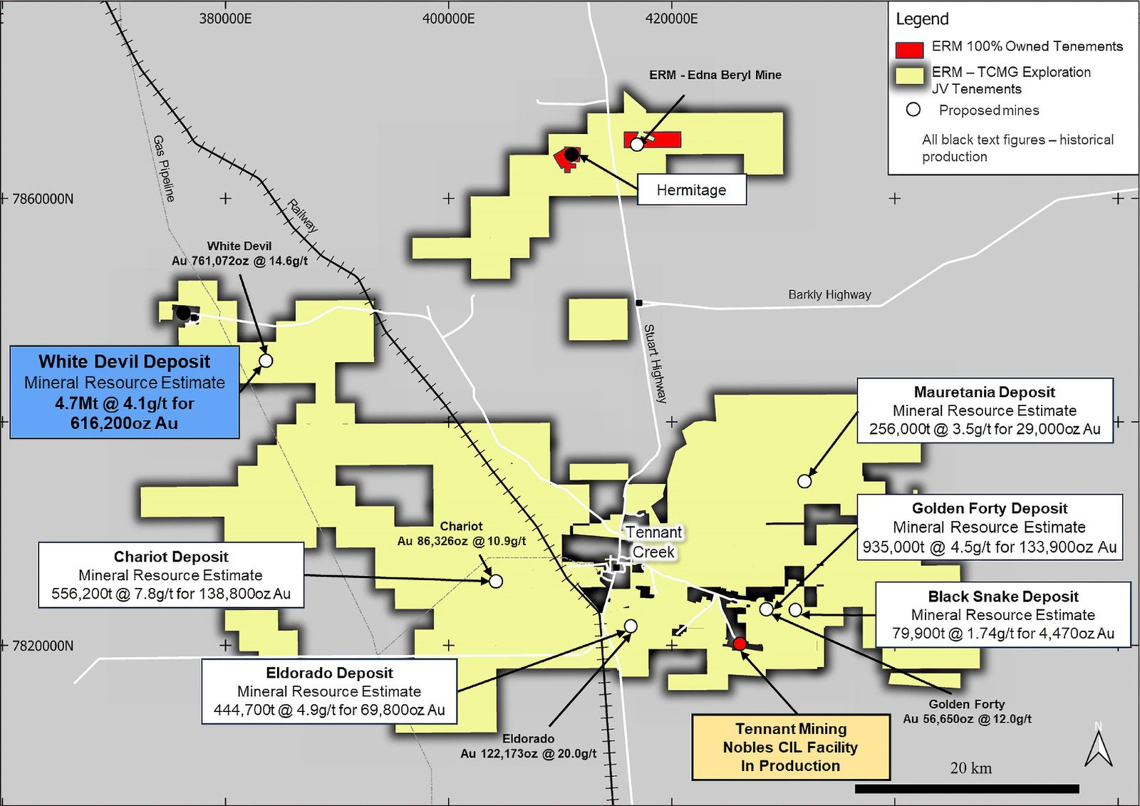 The White Devil deposit is located approximately 35km north-west of Tennant Creek in the Northern Territory and approximately 48km from the JV partner owned CIL processing facility at Nobles. The deposit consists of a historical underground mine which produced 1.62Mt at a recovered head grade of 14.6g/t gold for 761,072 ounces of gold production. Several ore positions remained unmined, and potential exists for extensions of high-grade gold mineralisation.